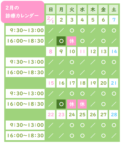 診療日程につきまして、2月の臨時休診および振替診療のお知らせです。