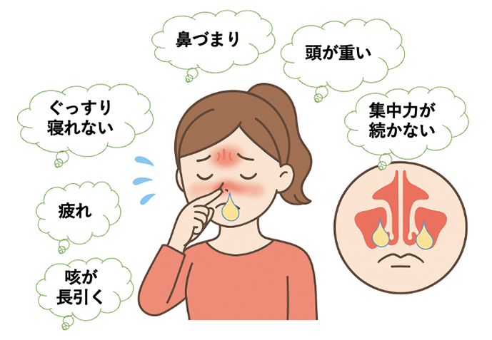 - 鼻づまりや頭重感などが長引き、生活の質が下がる