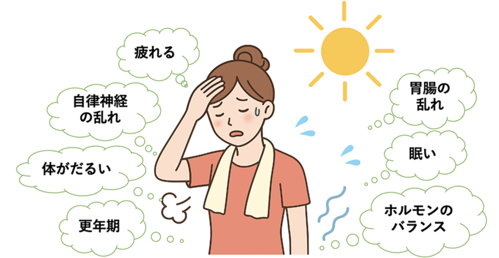 これらの負担が重なることで自律神経が乱れ、体力や胃腸機能が低下した状態を「夏バテ」と呼びます。